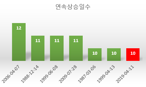 특히나 과거 시기와는 달리 이번 2019년 10일 연속 상승이라는 기록은 약세장 이후 막 고개를 들은 시점에서 달성된 기록이란 점에서 나름대로의 의미를 갖게 됩니다. 그리고 오늘 이 글을 쓰고 있는 금요일 오전 종합주가지수가 소폭 하락하고 있지만 4월 증시가 보여준 모습처럼 전약후강의 흐름이 나타난다면 11일 연속 상승이라는 기록도 기대 해 볼 수 있는 오늘 금요일 오전 장세입니다.