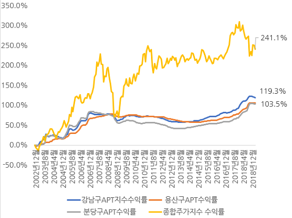 종합주가지수의 2002년 연말부터 2019년 3월 말까지 상승률은 241.1%를 기록하였습니다. 이에 반하여 주요 핵심지역구의 아파트 지수 상승률은 각각 강남구 119.3%, 용산구 106.1%, 분당구 103.5%를 기록하였습니다.