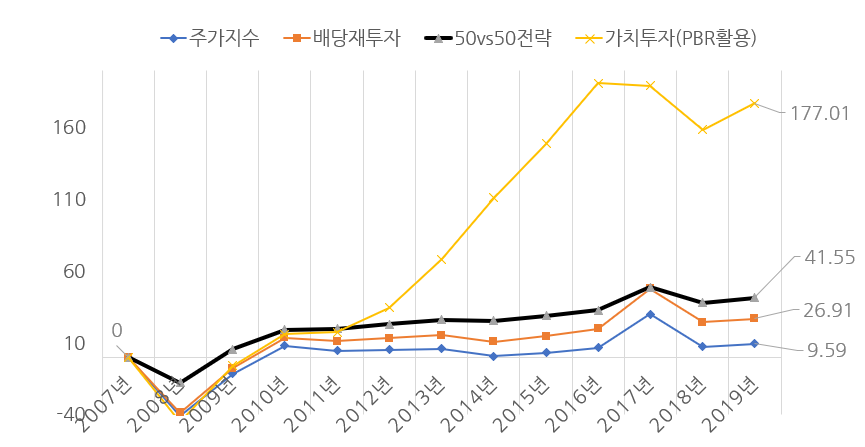 이 방법 또한 복잡한 방법이 아닌 단순한 가치투자 기준(PBR 및 주기적 리밸런싱)을 토대로 같은 기간 수익률을 추적하여보았습니다.