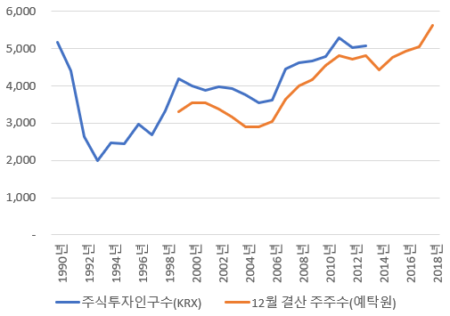 [1990년 이후 2018년까지 주식투자인구와 12월 결산법인 주주수 추이]