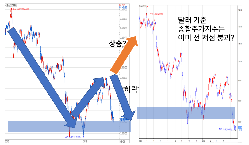 이런 상황에서 계속 미중 무역전쟁 중 화웨이에 대한 미국의 공격이 심화되고 있다는 뉴스가 쏟아지고 있는 가운데 몇몇 증시 분석가들은 종합주가지수를 달러 기준으로 구현한 차트를 올리기 시작합니다.