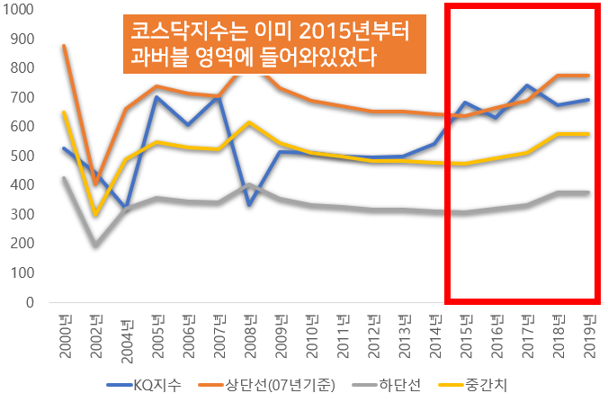 [코스닥지수는 2015년 이후 계속 부담스러운 밸류에이션 영역에 있었다]