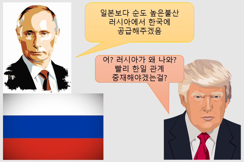러시아가 일단 불화수소만 들고 등장했지만 이 작은 카드가 일본의 대한국 무역보복에 미국의 중재를 빨리 끌어들이게 만들 것입니다.
