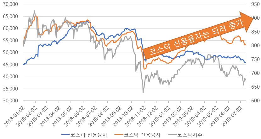 [코스닥 시장의 신용융자는 작년 가을 대비 오히려 증가하였다]