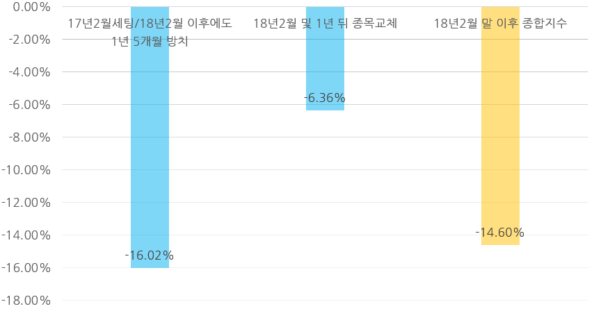 같은 기간 종합주가지수는 -14.6%하락을 만들었습니다만, 1년 단위로 포트폴리오를 변경한 경우에는 -6.36%로 상대적으로 양호한 하락률을 기록하였습니다. 하지만 2017년 2월에 세팅하여 1년을 보유하고도 1년 5개월을 방치한 총2년 반의 시간보유한 포트폴리오의 경우 -16%로 주가지수보다도 낮은 성과를 만들고 말았습니다.