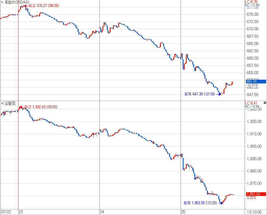 [이번주들어 매우 가파른 속도로 하락한 코스닥과 소형업종지수]