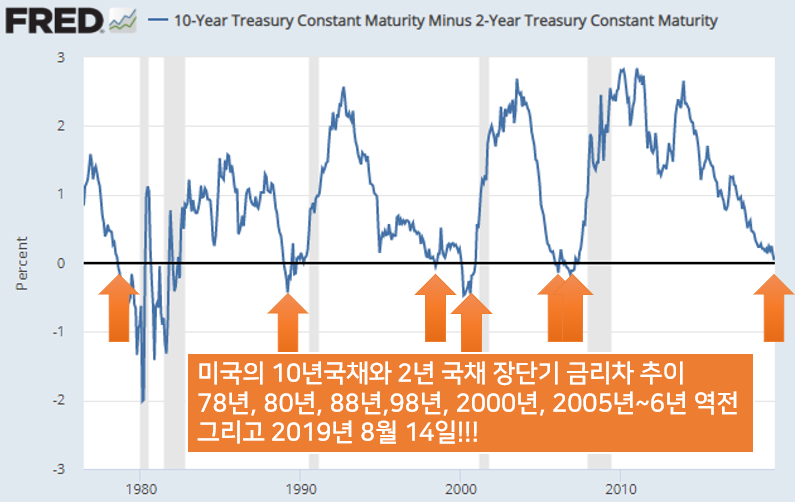 그리고 2019년 8월 14일, 드디어 미국채 10년-2년 장단기 금리차가 역전되면서 경제에 대한 극단적 비관론자들의 목소리가 높아지고 있습니다. 마치 지금 당장 한국이 멸망할 것처럼 목소리를 높이는 기사,글, 영상들을 늘고 있더군요.