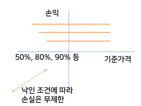 이러한 낙인/노낙인 구조의 경우 기준지수의 특정 영역에서는 기간에 따라 수익을 제공하지만 특정 범위를 넘어가는 순간 마치 풋옵션 매도 수익 구조처럼 기준가격이 낮아질 수록 손실이 -100%까지 커지는 구조가 만들어 집니다.