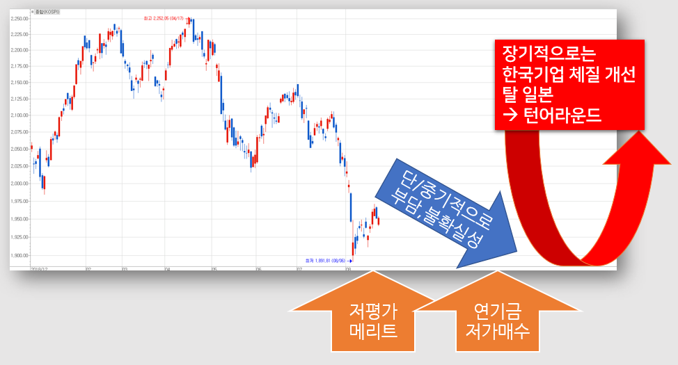 다만 종합주가지수 2000p이하에서는 절대 저평가 메리트가 높아지고 연기금들의 자산배분전략 상 오히려 국내 주식을 대량 매수해야한다는 점에서 단기 조정이 발생되면 예상보다 강하게 이겨내리라 기대 해 봅니다. 대신 증시 모멘텀까지 만들어지기는 아쉬운 부분이 남습니다.