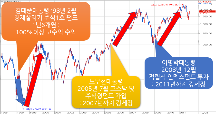 김대중 대통령, 노무현 대통령, 이명박 대통령 이렇게 세분의 대통령이 주식형펀드에 가입하던 시절은 증시가 녹록하던 시기는 아닙니다. 김대중 대통령이 가입했던 1998년 2월은 IMF사태가 발생한지 두달밖에 안된 시점이었지요. 그리고 노무현 대통령이 주식형펀드에 가입했던 2005년의 경우 주가지수 1000p를 넘어 있었지만 당시 대다수의 군중심리는 아직도 "이러다 또 폭삭 주저앉겠지"하던 때였습니다. (주가지수 1000p에서 매도하고 500p를 기다리던 투자자들이 대다수였습니다.)