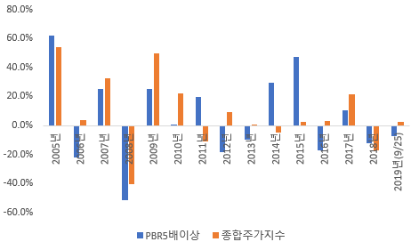 2005년초부터 2019년 9월25일(오늘)까지 종합주가지수는 133.2%의 누적성과를 만들었습니다만, PBR 5배이상 포트폴리오의 누적성과는 18.9%에 불과하였음을 확인할 수 있습니다.