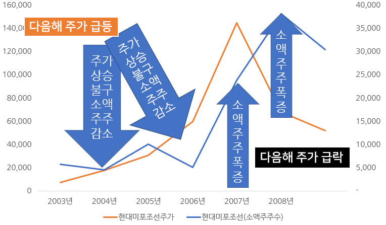 2003~2006년 현대미포조선이 강하게 치고올라가던 그 시기, 다른 종목같다면 주가 상승 과정에서는 소액주주수가 크게 증가했어야만 합니다. 그런데 이 기간 현대미포조선의 소액주주수는 2003년 5665명에서 2004년에는 오히려 4501명으로 감소하고, 2005년에는 1만명으로 늘었지만 2006년에는 5천명으로 급감하는 현상이 나타났습니다. (위의 표 참조)