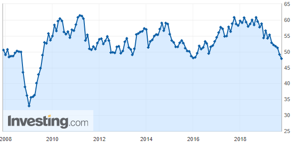 미중 무역전쟁이 시작 초기인 작년 9월 발표만 하더라도 ISM제조업지수가 60.8까지 올라서는 등 호조세를 보여주었지만, 점점 미중 무역전쟁이 장기화되어가면서 매달 지수가 발표될 때마다 서서히 낮아지기 시작하였고, 급기야 이번에 ISM제조업지수가 50선을 무너트리고 말았습니다.