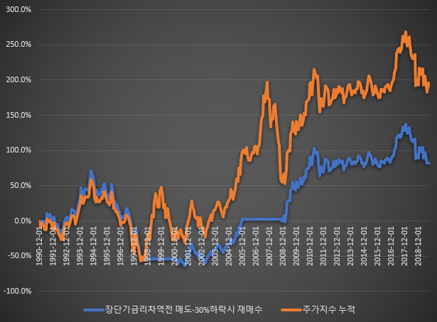 [장단기금리차 역전 후 주가지수 -30%이상 하락시 재매수 전략과 종합주가지수]