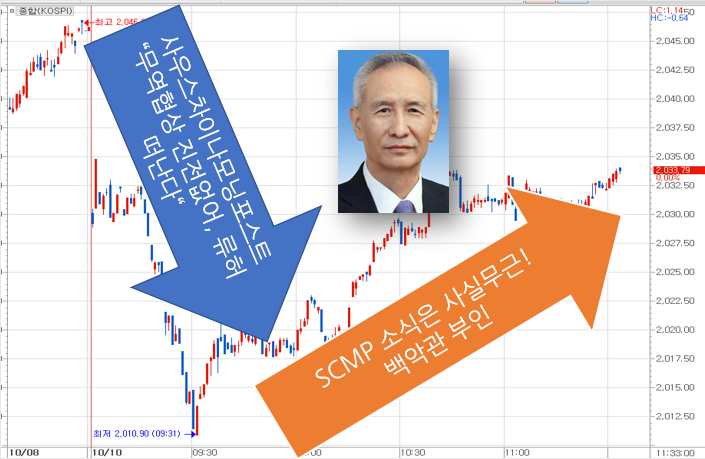 오늘 아침증시를 흔든 이유는 중국 류허부총리가 하루만 머물다 갈 것인가 아닌가에 관한 뉴스가 엇갈렸기 때문입니다. 개장 전에는 SCMP(South China Morning Post)발 중국 대표단의 조기 귀국 뉴스에 한국증시가 2%가까이 하락하였습니다만 9월 20분경 SCMP의 기사를 반박하며 금요일까지 머문다는 소식이 중국어 뉴스로 나오면서 증시하락은 상승으로 돌변하였습니다.