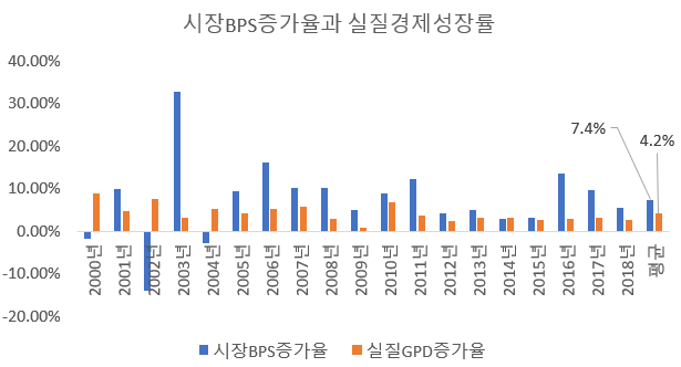 2000년 이후 2018년까지 연평균값으로 계산하여보면 시장BPS증가율은 7.4%였고 실질경제성장률은 4.2%로 3.2%p앞선 흐름을 보여줍니다.