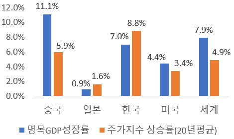 중국, 일본, 한국, 미국, 세계전체의 5개의 케이스에서 명목경제성장률과 주가지수 등락률의 상관계수는 0.64수준에 이를 정도로 높은 값을 보이니 20년이라는 장기적인 측면에서는 명목경제성장률이 주가지수와 매우 밀접한 관계가 있음을 확인할 수 있겠습니다.