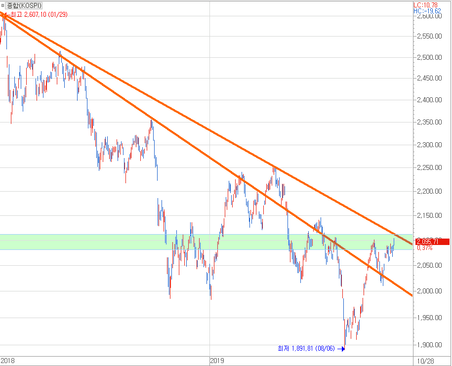 아이러니하게도 작년초 이후의 하락추세선 중 하나가 주가지수 2100p 부근에서 걸쳐있군요. 만약 이번에 확실하게 주가지수 2100p를 뚫고 올라간다면 갭상승 또는 장대양봉을 동반하는 강한 상승이 나오면서 파죽지세로 2018년 1월이후 시작된 하락추세선 하나를 뚫고 올라가지 않을까 싶습니다.