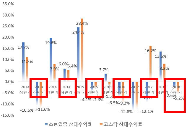 위의 표는 종합주가지수와 소형업종지수 그리고 코스닥지수의 상반기/하반기별 상대적 수익률을 표시한 도표입니다. 2013년 이후 매년 하반기에는 스몰캡들이 종합주가지수에 비해 상대적으로 뒤쳐진 성과를 보여왔음을 확인할 수 있습니다.