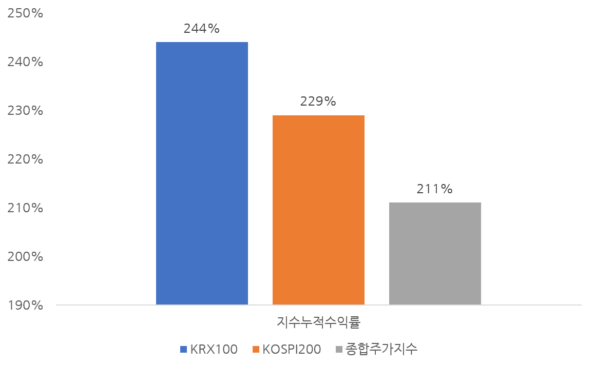 대략적인 연환산 수익률로는 KRX100지수가 7.1%, 코스피200지수가 6.8%, 종합주가지수가 6.5%를 보여주고 있습니다. 매년 0.3%p씩 앞선 성과를 만든 것입니다.