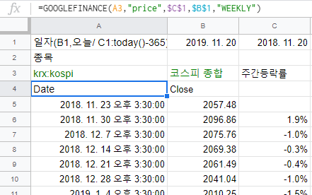 이렇게 하신 후 A4셀에서 =GOOGLEFINANCE(A3,"price",$C$1,$B$1,"WEEKLY")
