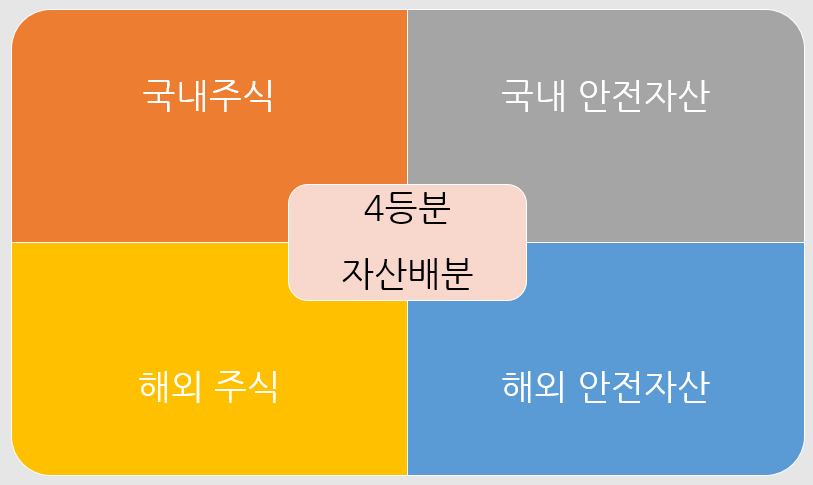 사등분 전략은 거창한 방법이 아닙니다. 자산을 안전자산과 위험자산(주식)으로 반반 나누고 안전자산과 위험자산(주식)을 국내/해외로 나누어 사등분 하는 것이지요.
