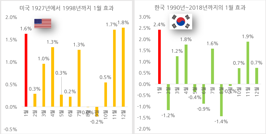 그런데 미국이든 한국이든 1월에 급하게들 되사들이다보니 1월에 증시가 다른 달에 비해 상대적으로 강하게 나타나는 현상이 관찰됩니다. 이 현상이 바로 1월 효과이지요.