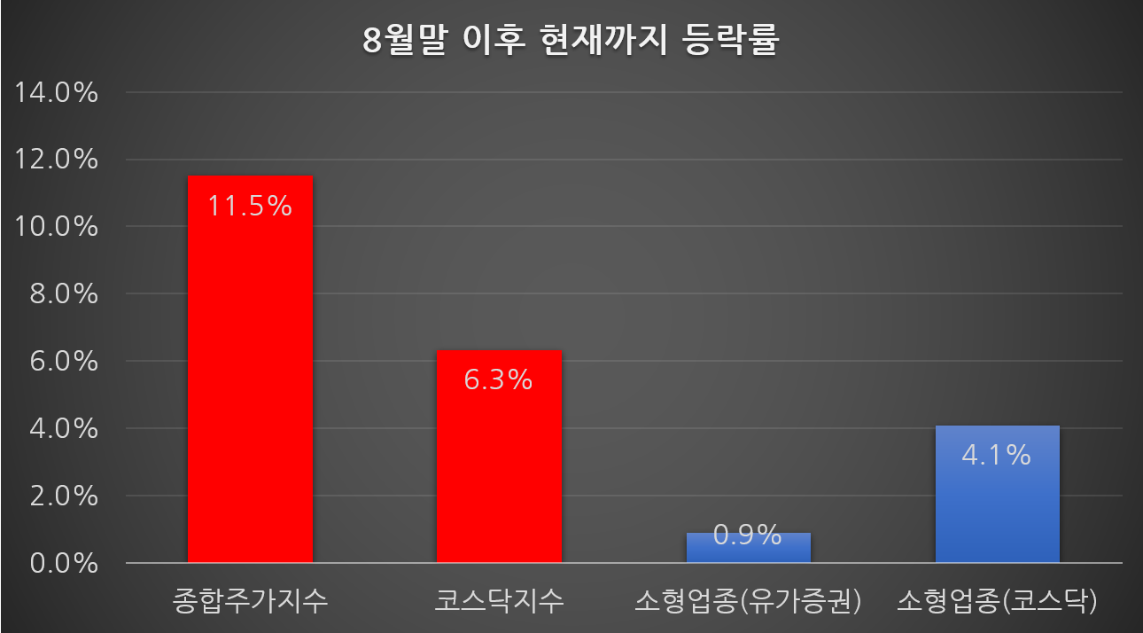 ㅇ 올해 8월 말 이후 소형업종 상승률 0.8%, 종합주가지수 상승률 11.5%
