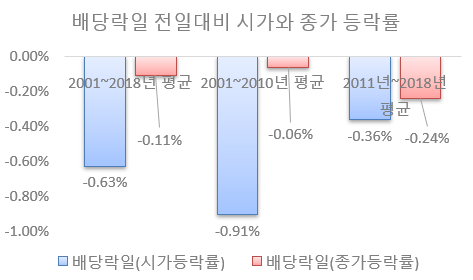 위의 표는 2001년부터 2018년까지 종합주가지수의 배당락 당일 시가와 종가의 전일종가대비 등락률 평균치입니다.
