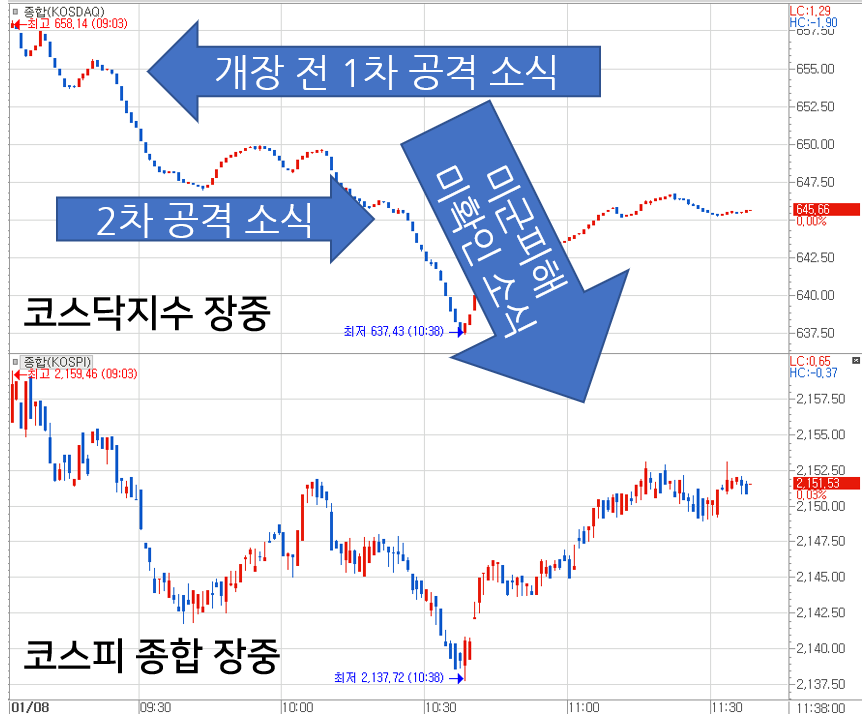 개장 직전 쏟아진 이란의 1차 공격 뉴스에 "전쟁이 시작되었다"는 불안감은 폭발하여 시장에 매물을 쏟아냈고 연이어진 2차 공격 소식과 확인되지 않은 미군 피해 규모 소식은 단 1시간 반만에 코스닥지수를 4%가까이 하락시키는 원인이 되고 말았습니다.