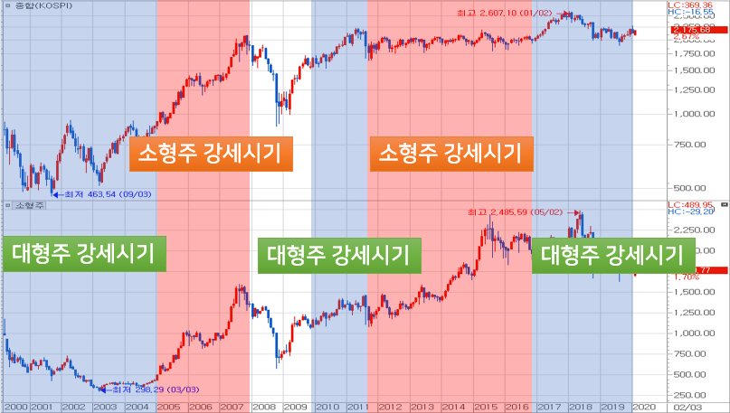 [대형주와 소형주 순환하며 강세시기 약세시기가 엇갈린다]