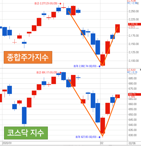 [신종 코로나 이슈는 이제 증시에서 악재로서의 생명력을 잃으며 증시는 V반등하고 있다]