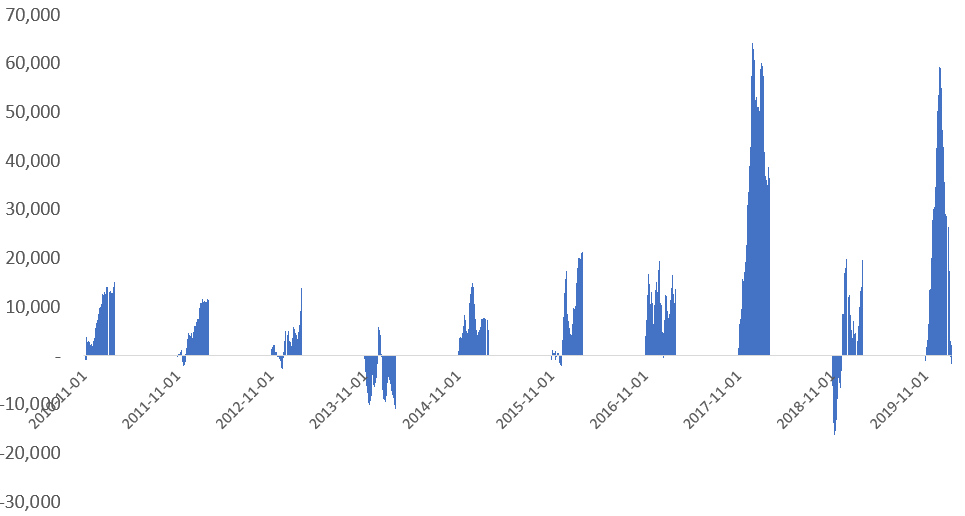 문득 궁금해진 생각에 금융투자의 수급을 직전년도 11월초부터 새해 2월말까지 4개월간 누적하고 그 이후 8개월 동안은 누적값을 Clear하는 작업을 한 후 2010년 연말부터 최근 자료를 도표로 만들어 보았습니다.