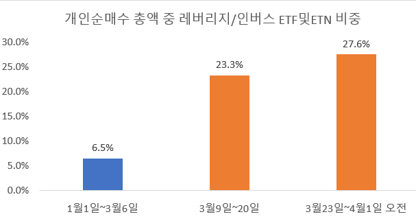 특히 3월 23일 2030세대 투자자들이 급증한 이후로는 단일방향으로 베팅하는 레버리지ETF와 인버스ETF의 순매수 비중이 급격히 높아진 것입니다.