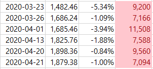 3월 23일 본격적인 반등장이 시작된 이후 개인이 5천억원이상 유가증권시장에서 순매수한 경우는 주가지수가 큰폭의 하락을 만들었을 때입니다. 이는 증시가 하락하기만 하면 줍줍하며 사들이겠다는 개인의 현재 심리가 그대로 반영되어있다 하겠습니다.