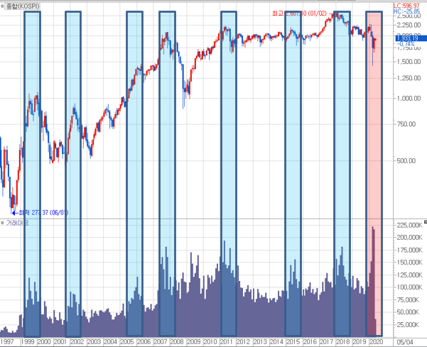 그런데 2020년 3~4월 사상 최대 수준의 거래대금 폭발이 코스피/코스닥 양시장에서 발생하였습니다. 하락추세에서 발생한 매우 이례적인 거래대금폭발이기에 이에 대한 해석을 어찌해야할지 고심하는 분위기가 느껴집니다.