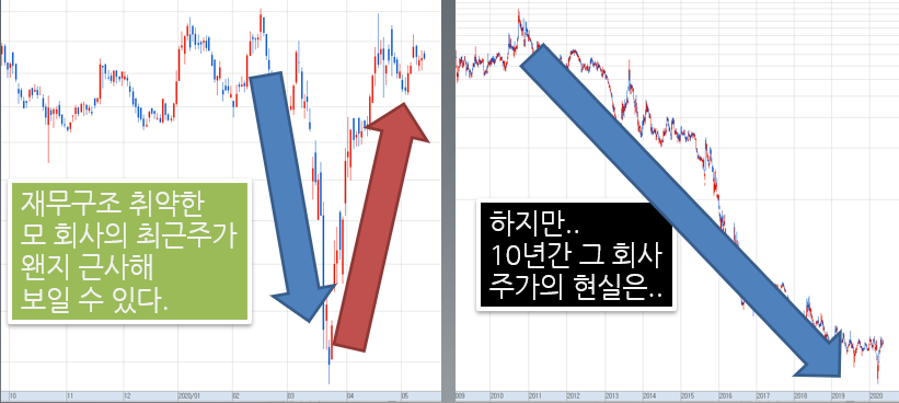 현재 부채비율이 500%가 넘어가는 모회사의 주가를 짧게 최근 1년 그리고 길게 최근 10년을 함께 표시 해 보았습니다. 재무구조가 취약한 해당 회사 올해 3월 주가 급등락만 보면 이런 상상을 하실 것입니다.
