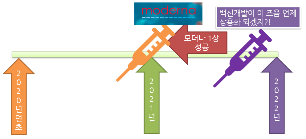 코로나19 종식의 마침표인 백신개발이 내년 2021년 저 멀리 안보이던 곳에 있었는데 이번 모더나의 백신물질 1상 성공으로 그 시점이 한참 앞으로 당겨졌습니다.