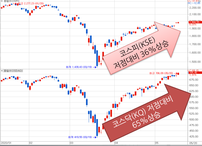 지난 3월 19일 패닉 쇼크와 함께 증시가 최저점을 만든 이후 시장은 큰 조정 없이 꾸준히 상승하였습니다. 3월 19일 이후 코스피 종합주가지수는 오늘 12시까지 36%상승하였고 코스닥지수는 65%상승하였으니 코스닥지수가 코스피 종합주가지수보다 2배가까이 더 상승했다고 해도 과언이 아닐 것입니다.