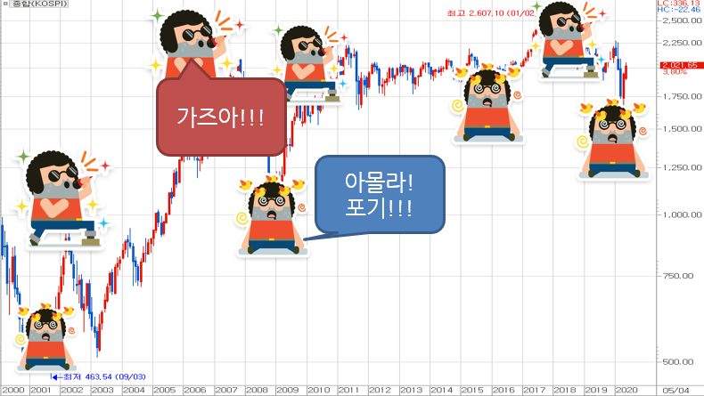 과거 개인투자자들은 증시가 폭등하고 과열단계에 이르러서야 돈을 들고 주식시장으로 들어왔지요. 그리고 화려한 랠리의 짧은 환희를 맞고는 대폭락장을 경험하고 바닥에서 떠나는 일이 다반사였습니다.