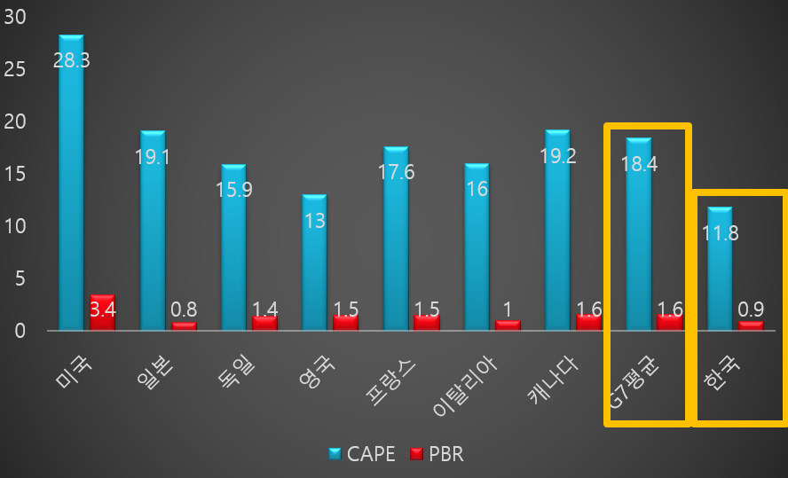 CAPE기준으로는 한국증시가 G7국가들의 멀티플에 2/3수준이고 시장PBR기준으로는 56%수준에 불과합니다.
