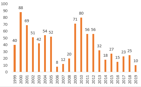 위의 자료는 KIND(한국거래소 전자공시)에서 1999년부터 최근까지 상장폐지된 종목 1340여 종목 중 불미스럽게 상장폐지된 케이스 860여개를 발췌하여 연도별로 상장폐지 종목수를 표시한 도표입니다. (※ 언제나 그렇듯 데이터 정리는 힘들어요)