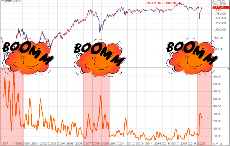 위의 표는 대규모 개인의 자금이 유입된 시기와 BWI라는 변동성 지표를 종합주가지수 차트에 함께 표시한 것입니다. 큰 개인투자자금의 유입되는 시기에 시장 변동성은 우연이든 필연이든 폭발하였고 그 후에도 시장 변동성은 높은 수준에서 메아리치다가 점점 변동성이 낮아지게 됩니다.
