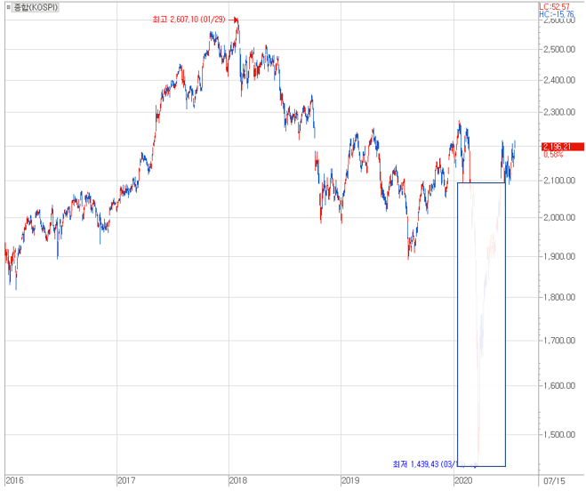 위의 주가지수 차트는 3월~5월부분을 가려본 차트입니다. 우리가 3~5월 주가지수 차트와 같이 볼 때보다 느낌이 다르실 것입니다. 맞습니다. 최근 증시가 급반등하기는 하였습니다만, 이제 겨우 원점으로 돌아온 것입니다. 겨우... 말입니다.