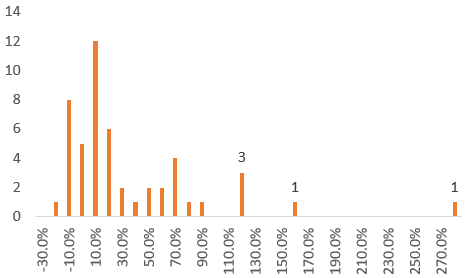 0%~ 10%이내의 수익률 구간의 종목수가 12종목으로 가장 많았고 이례적으로 100%이상의 수익률이 발생한 종목이 5종목 있었습니다. 그리고 최대 손실을 기록한 종목은 -26.2%부터 최대 277.2%를 기록한 종목까지 총 50여개의 종목들은 다양한 수익률 분포를 만들었습니다. 이 들 종목의 평균수익률은 29.5%로 좋은 성과를 내었습니다.