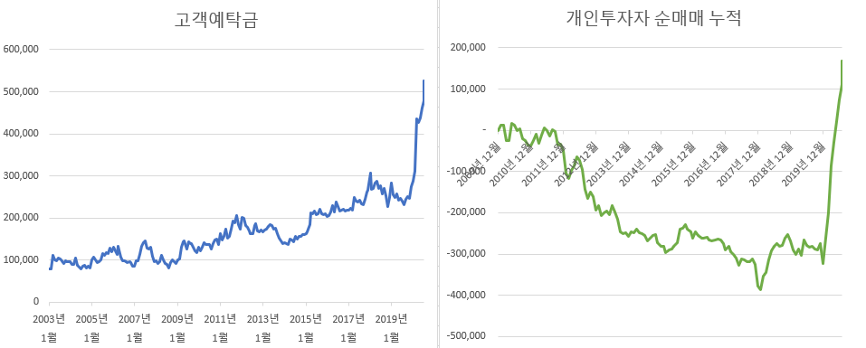 위의 자료는 고객예탁금과 개인투자자 순매매 추이 자료 입니다.