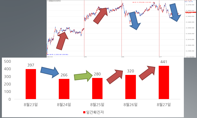 [코로나 일간확진자 추이와 종합주가지수 장중흐름 8월24일에서 27일]