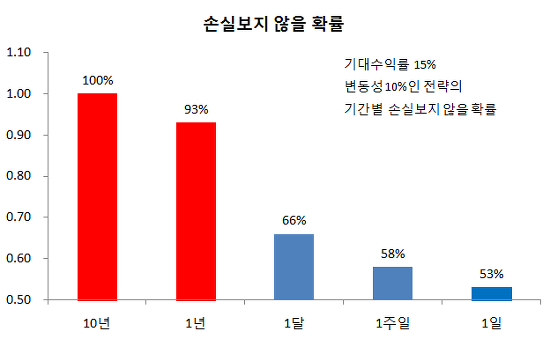 즉, 주식투자를 장기적인 시계열로 투자할 경우 승률이 100%에 근접하지만, 짧은 시계열로 단타에 치중할 경우 수익을 낸 확률은 50%, 짤짤이 확률에 머물고 맙니다.