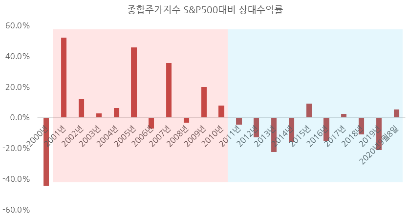 대략 10여년 한국증시는 미국증시에 압도적인 열위에 있었습니다. 2010년까지는 그런데로 한국증시가 미국증시에 비해 앞서간듯 하였습니다만, 2011년부터 2019년까지 한두해 빼고는 미국증시에 비해 뒤쳐졌습니다. 1년에 두자리수의 등락률 차이로 미국증시에 비해 못난 흐름을 보여왔던 한국증시. 하지만 2020년들어 동등하게 움직이기 시작하였고 2020년 9월을 기점으로 분위기를 역전하려 하고 있습니다.