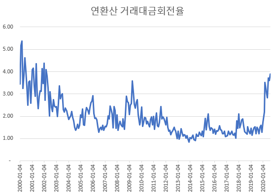 [월단위 연환산 거래대금 회전률 : 2020년 회전률은 2000년 초반수준까지 높아졌다]